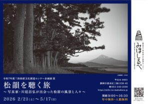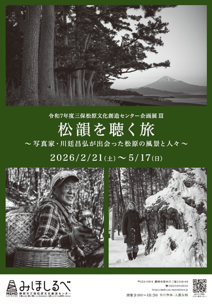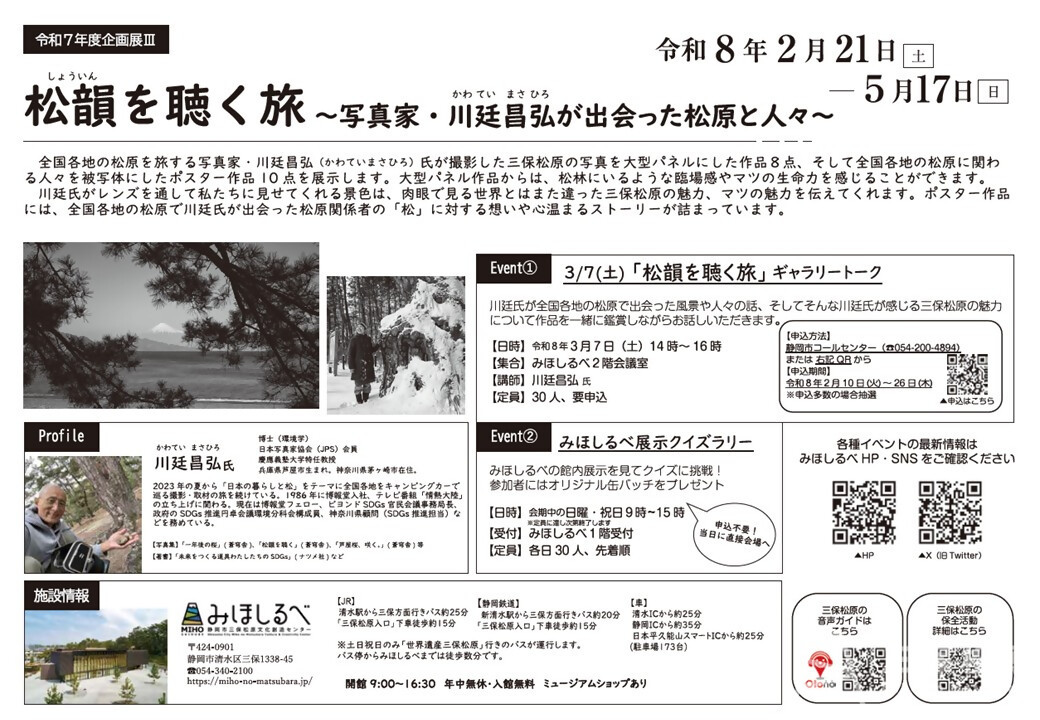 全国各地の松原を旅する写真家・川廷昌弘(かわてい・まさひろ)氏が撮影した三保松原の大型写真パネル、各地の松原に関わる人々を被写体としたポスター作品を展示します。松林にいるような臨場感やマツの生命力を感じることができます。